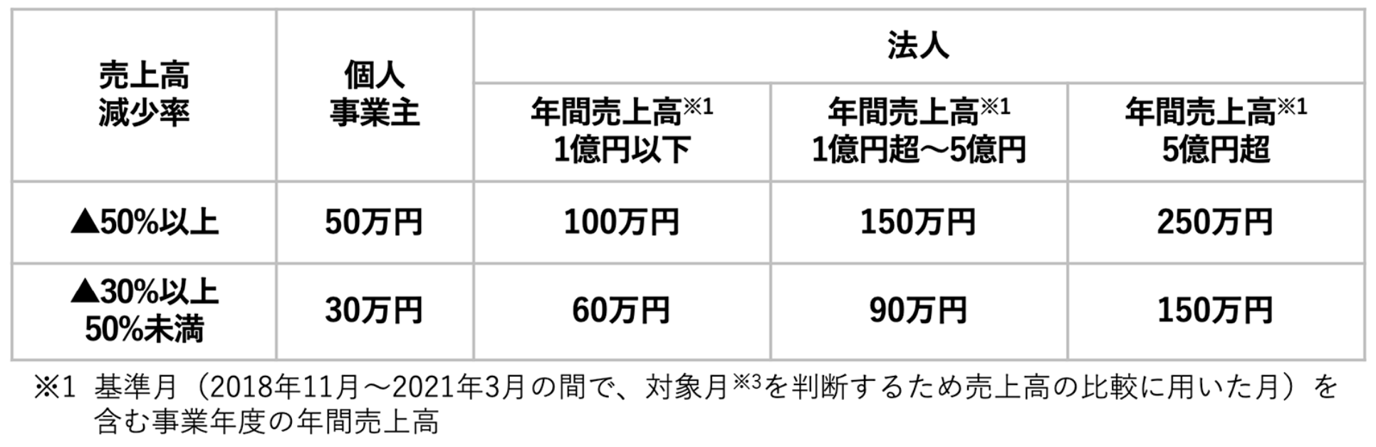 新型コロナウイルス感染症の影響を受けて、2021年11月~2022年3月のいずれかの月の売上高が、2018年11月~2021年3月までの間の任意の同じ月の売上高と比較して50%以上又は30%以上50%未満減少した事業者